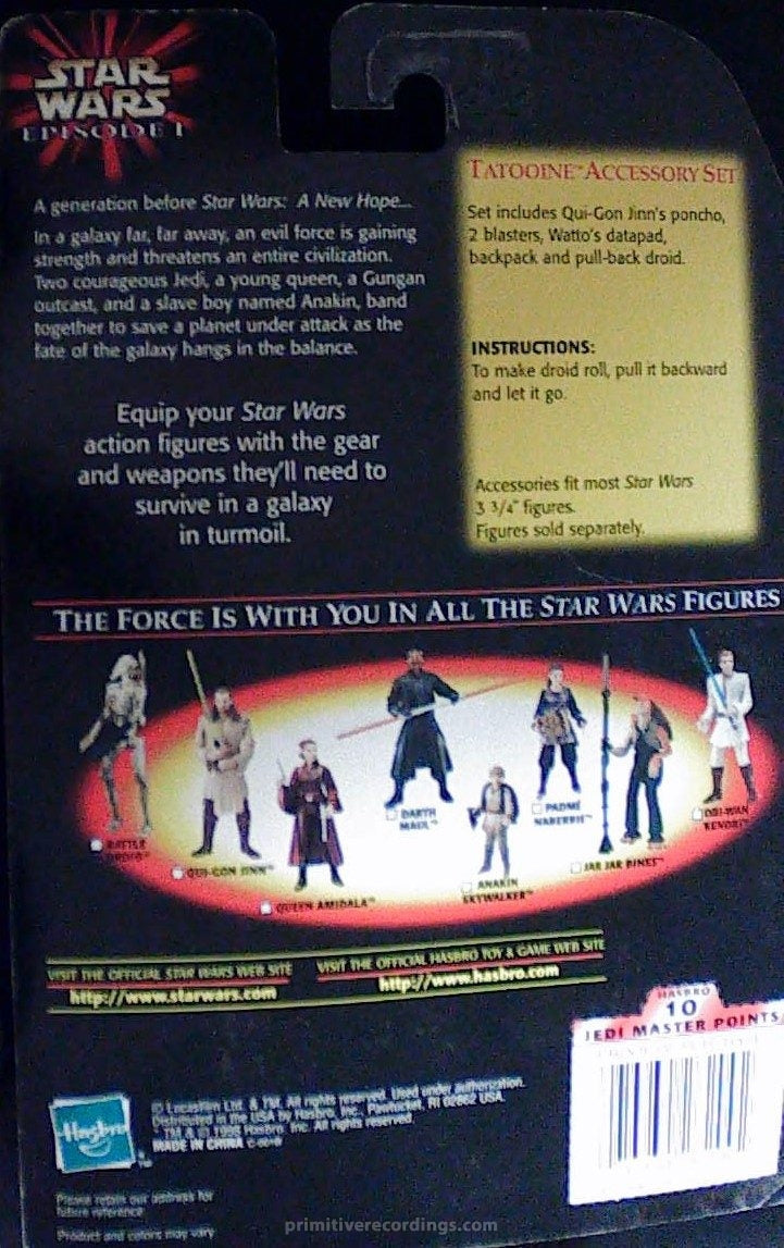 The Phantom Menace Tatooine Accessory Set from 1998 by Hasbro is a collectible item that captures the essence of the Star Wars prequel era. This set includes detailed accessories inspired by the Tatooine environment, enhancing any action figure display or diorama. The card is preserved in good condition, maintaining its value for collectors and enthusiasts. Ideal for those seeking authentic memorabilia from the Phantom Menace film, this accessory set offers both nostalgic appeal and a tangible connection to the Star Wars universe’s iconic desert planet.
