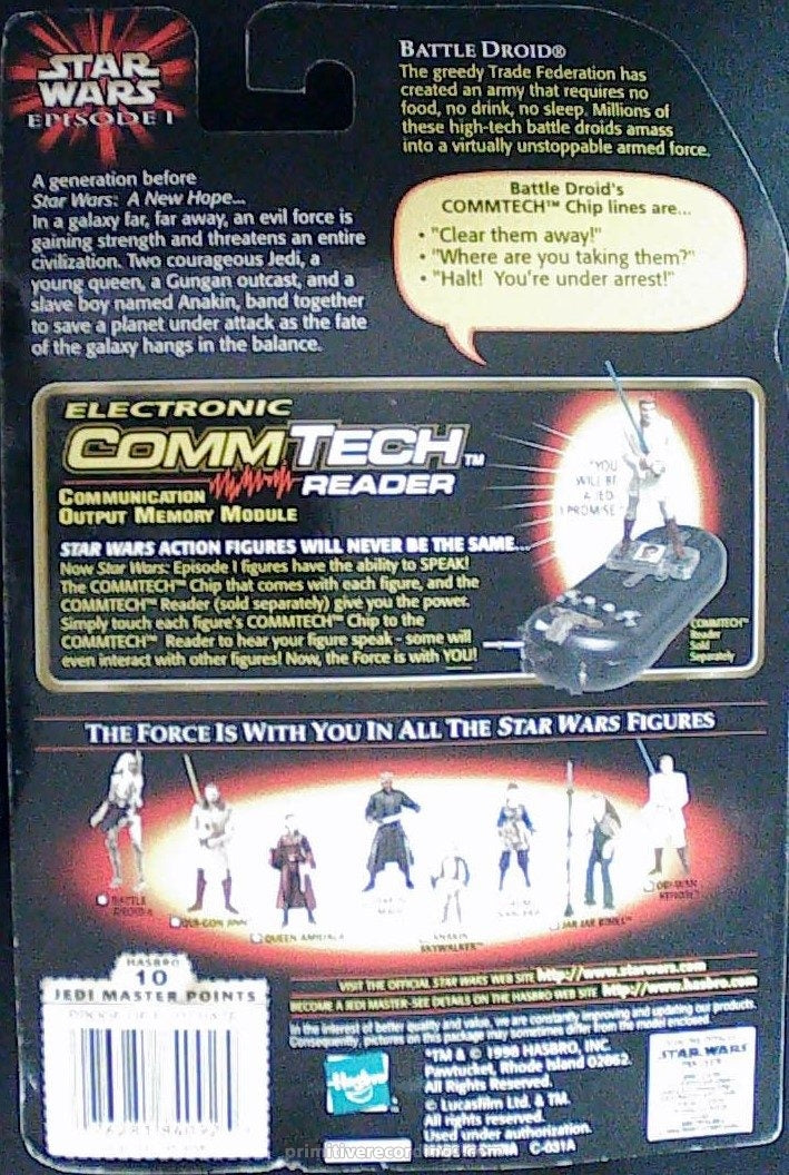 The Phantom Menace Battle Droid CommTech action figure is a detailed collectible from the Star Wars universe, representing the iconic battle droids featured in Episode I. Crafted with precision, this figure captures the mechanical design and articulation true to the original character. It is in good condition, making it a valuable addition for collectors and enthusiasts seeking authentic memorabilia. Ideal for display or as part of a comprehensive Star Wars collection, this CommTech figure offers both nostalgic appeal and expert-level craftsmanship.