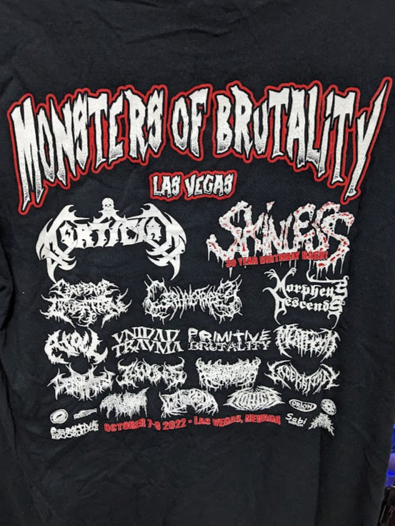 The Monsters of Brutality 2022 Screen printed T-Shirt is a premium garment designed for fans of heavy music and bold graphic art. Crafted with high-quality fabric, it offers durability and comfort for everyday wear. The detailed screen printed design captures the raw energy and intensity of the 2022 Monsters of Brutality epic 30th Birthday Bash Metal Event for the band Skinless, which featured Legendary Bands, Mortician and Morpheus Descends, and also a sick line-up of bands that included Primitive Brutality, Atoll, Meathook, Unidad Trauma, Foul Deformity, Cerebral Incubation, Laceration, Goreatorium, Mohler and more, making it a standout piece in any collection. Perfect for concerts, casual outings, or as a collector’s item, this t-shirt combines style and substance, reflecting the spirit of brutal music culture with expert craftsmanship. Front and back print.
