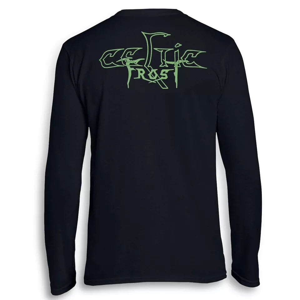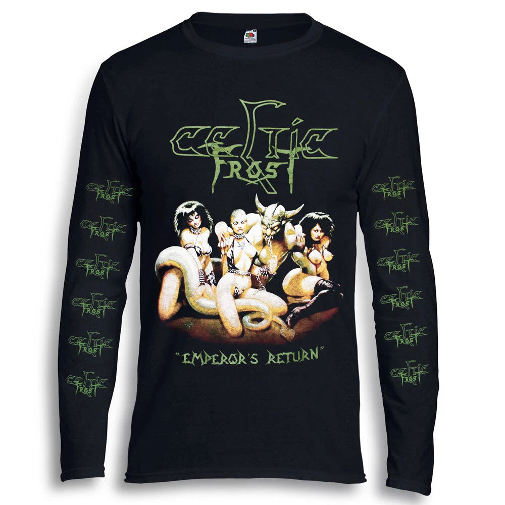 The Emperor's Return Long Sleeve Import Shirt by Celtic Frost features striking printed sleeves and a bold back print, embodying the band's iconic aesthetic. Crafted with attention to detail, this shirt offers both comfort and durability, making it ideal for fans who want to showcase their appreciation in style. Its imported quality ensures a premium fit and finish, perfect for layering or wearing on its own. Whether at a concert or casual outing, this long sleeve shirt delivers a distinctive look that honors the legacy of Celtic Frost.