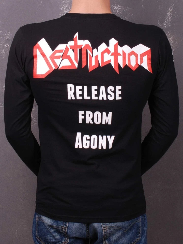 The Release from Agony Long Sleeve Import T-Shirt by Destruction offers a bold statement with its striking back print and detailed printed sleeves. Crafted for fans who appreciate both style and comfort, this shirt combines high-quality fabric with a design that captures the intensity of the band's iconic imagery. Perfect for everyday wear or concert nights, it delivers durability and a standout look that honors the spirit of metal music. Elevate your wardrobe with this expertly designed long sleeve tee that balances artistic expression and lasting comfort..