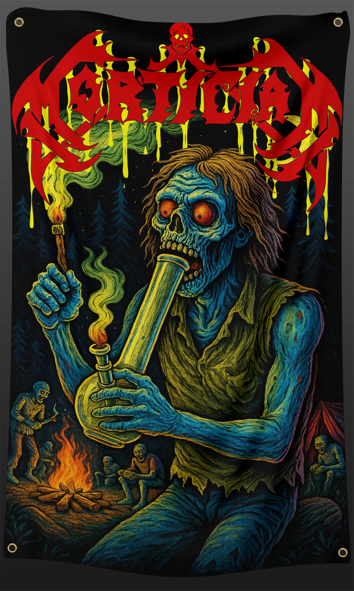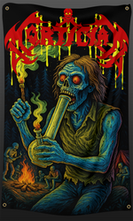 Display your passion for underground metal and counterculture with this striking 3 x 5 foot Mortician Bong Zombie Flag. The design captures the raw aesthetic of Mortician, making it an ideal statement piece for bedrooms, music venues, or festival spaces. Grommets in the corners for hanging. Perfect for collectors of underground band merchandise and those seeking authentic visual representation of the metal scene.