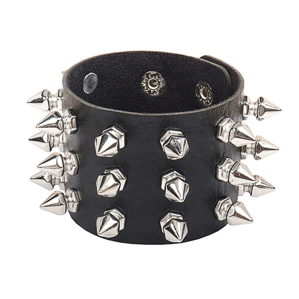 Elevate your edgy style with this expertly crafted 3 Rows Short Spike Rivet Bracelet. Featuring three tightly arranged rows of sharp, polished spikes, this bracelet delivers a bold statement while maintaining a sleek, wearable design. Made with durable materials, it offers both lasting quality and comfort for everyday wear. Perfect for adding a rebellious touch to any outfit, this bracelet is a must-have accessory for those who appreciate detailed craftsmanship and distinctive fashion.