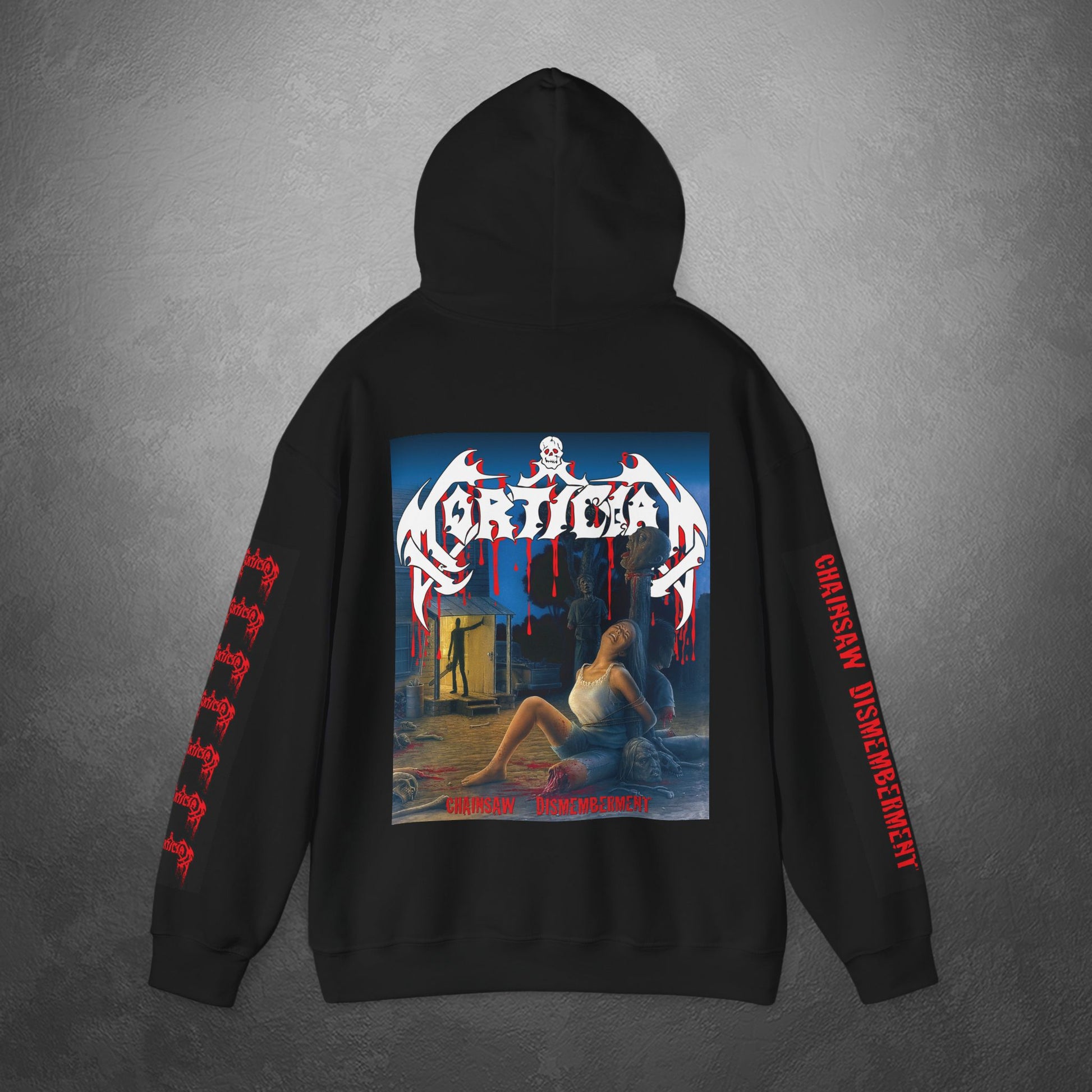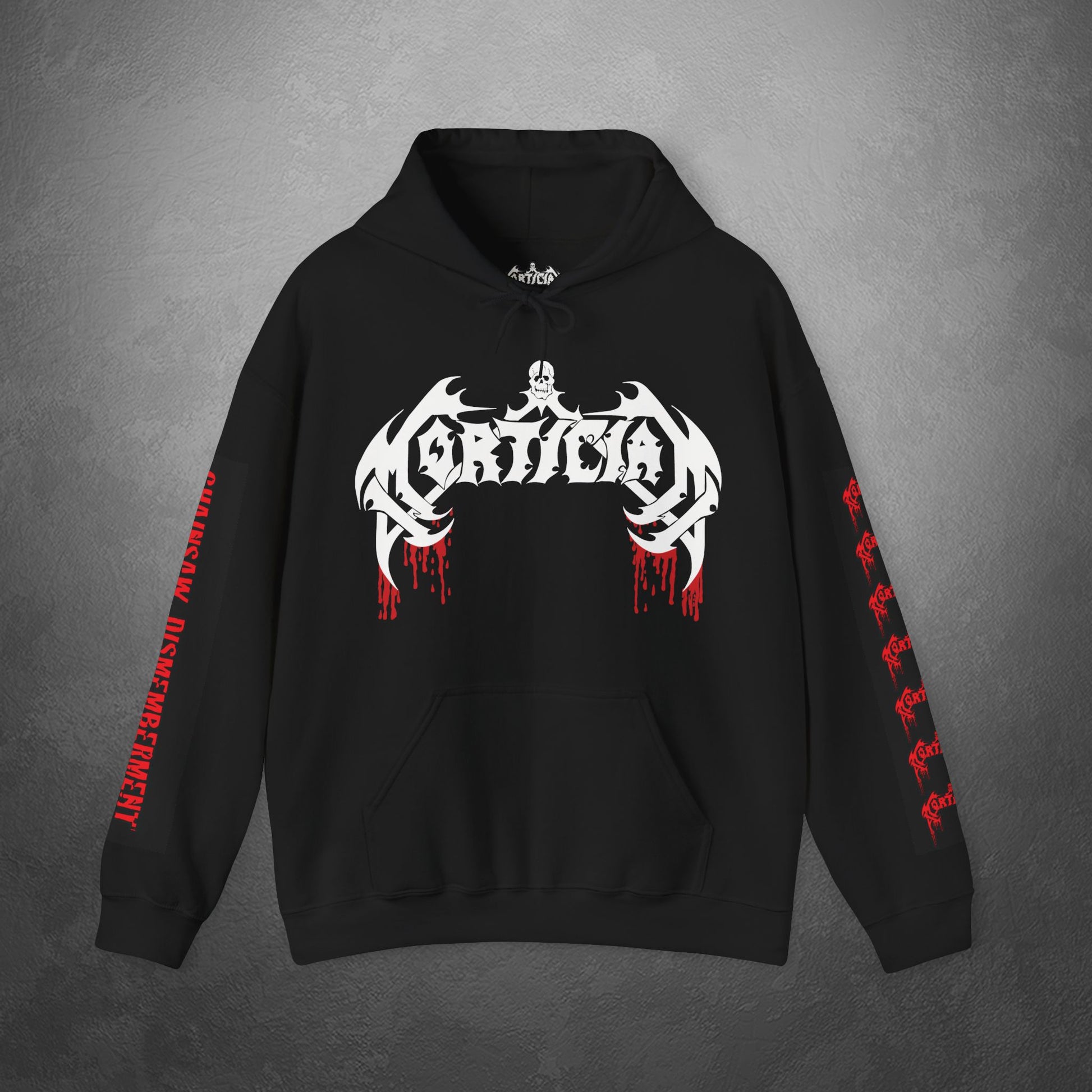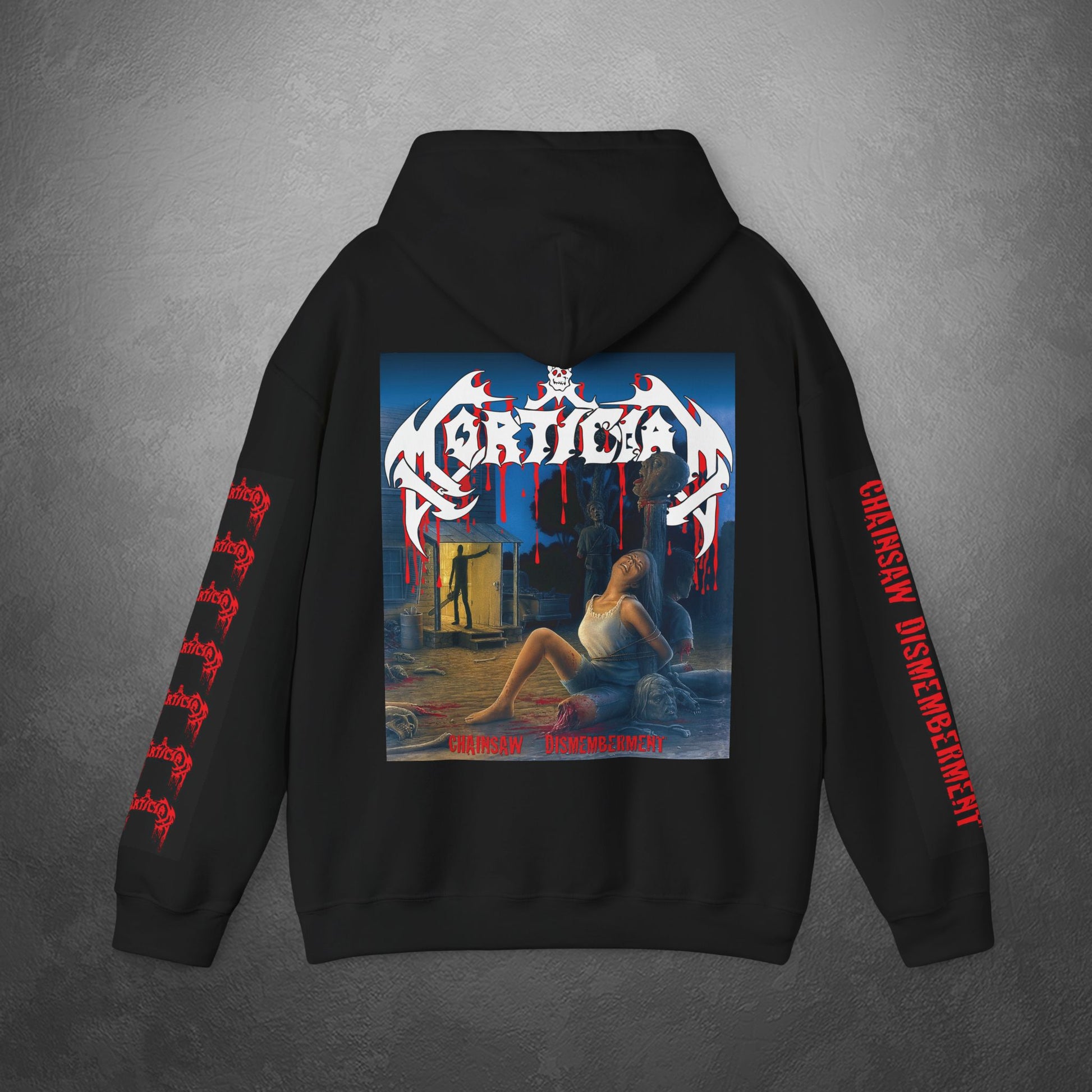 Killer Mortician Chainsaw Dismemberment Hooded Sweatshirt w Printed Sleeves!