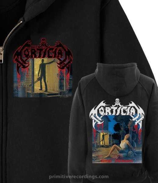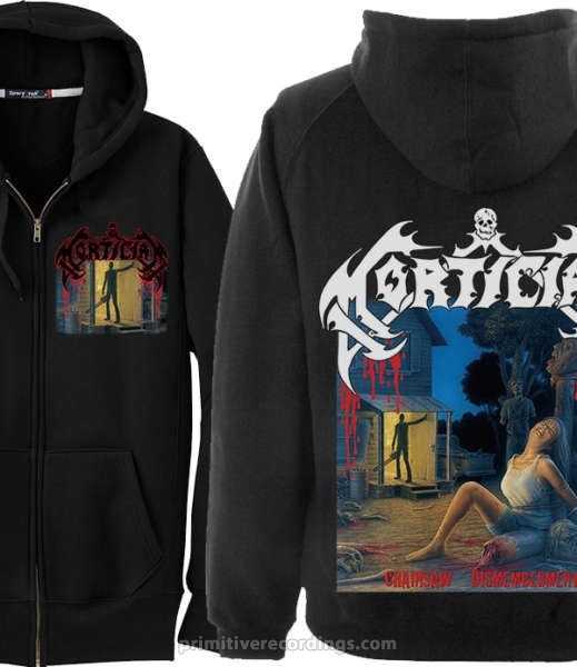 Experience the Mortician "Chainsaw Dismemberment" Zipper Hoodie, featuring a vibrant full-color print on the chest and detailed album art on the back. Crafted with high-resolution printing for sharp, lasting imagery, this hoodie combines bold design with comfort. It ships directly from the printers and includes free shipping within the US, making it a seamless addition to your collection.
