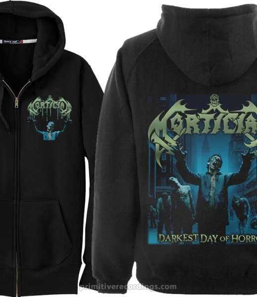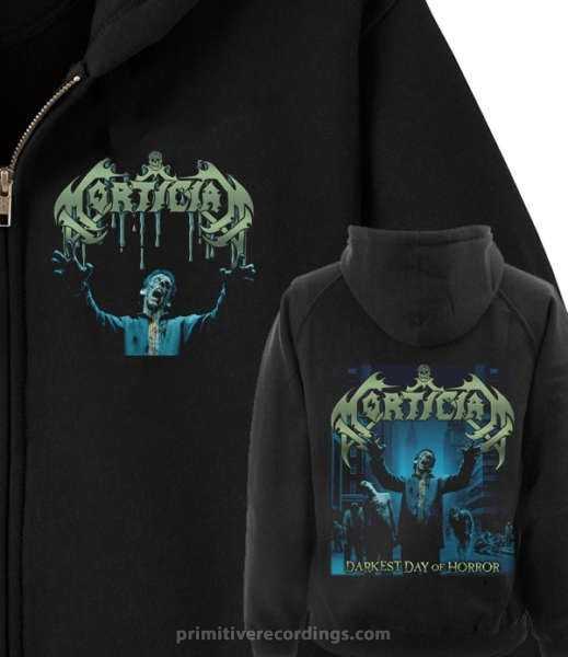 Experience the Mortician "Darkest Day Of Horror" Zipper Hoodie, featuring vibrant full-color prints on both the chest and back that showcase the album's iconic artwork in high resolution. Crafted for comfort and style, this hoodie ships directly from the printers with free shipping included, making it a distinguished addition to any fan’s collection.