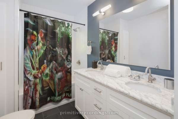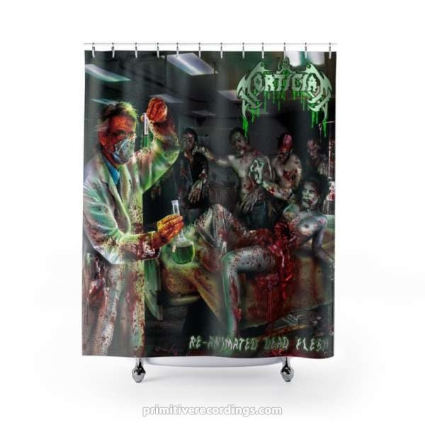 Sick Mortician Re-Animated Dead Flesh Shower Curtains measure 71" x 71" and bring a bold statement to your bathroom decor. Crafted from 100% polyester with a vibrant one-sided print, these durable curtains include hooks for easy installation. Perfect for adding a unique and personal flair to your most private space.