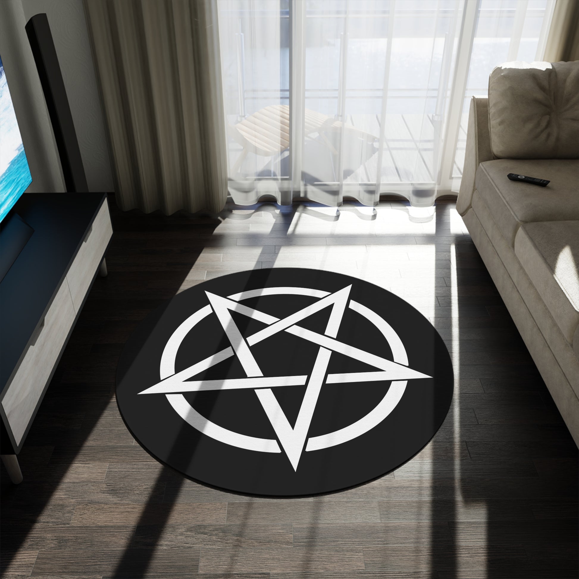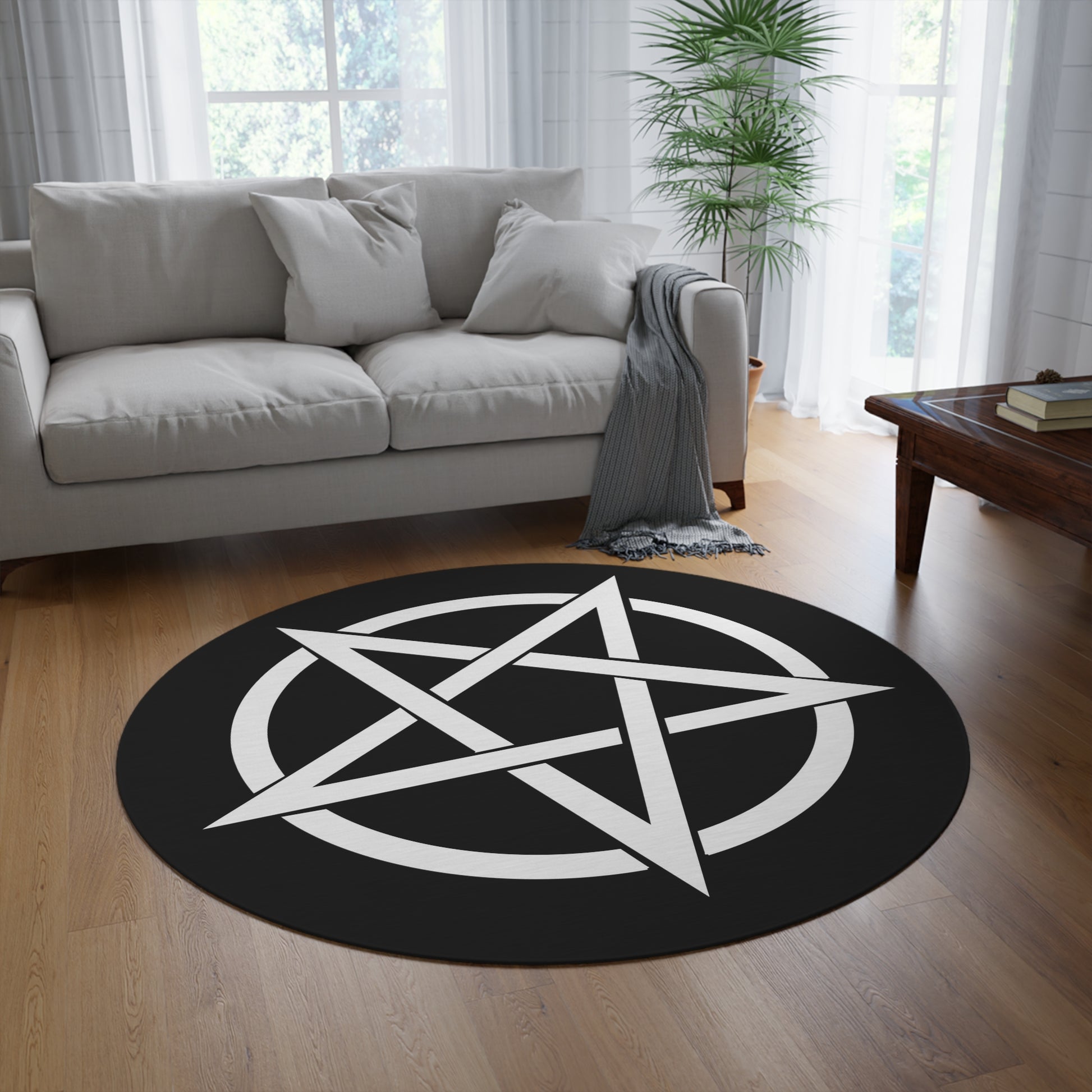 Pentagram Giant 5 Foot Circle Rug! It features a coated backing and hemmed edges for durability.