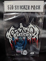 The Mortician Hacked Up For Barbecue Sticker Pack features a 6-inch logo, a 3.25-inch logo, a full-color artwork sticker, and additional skull designs. All stickers are made from glossy vinyl for durability and vibrant appearance.