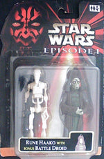 The Rune Haako action figure with Bonus Battle Droid from Hasbro, released in 1999, is a valuable collectible for Star Wars enthusiasts. This figure captures the distinctive features of Rune Haako, a key character from the Star Wars prequel trilogy, accompanied by an additional Battle Droid figure. Both items are preserved in good condition, making them ideal for collectors seeking authentic vintage Star Wars memorabilia. The set offers a nostalgic glimpse into the classic Hasbro craftsmanship of the late 1990s, combining character detail with playability and display appeal.