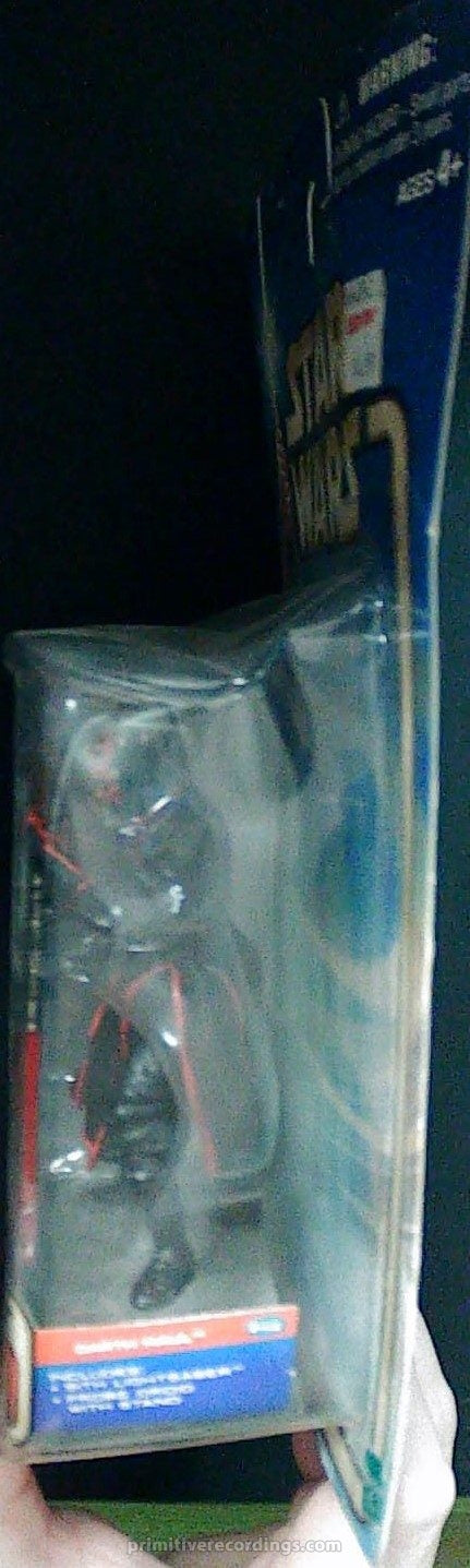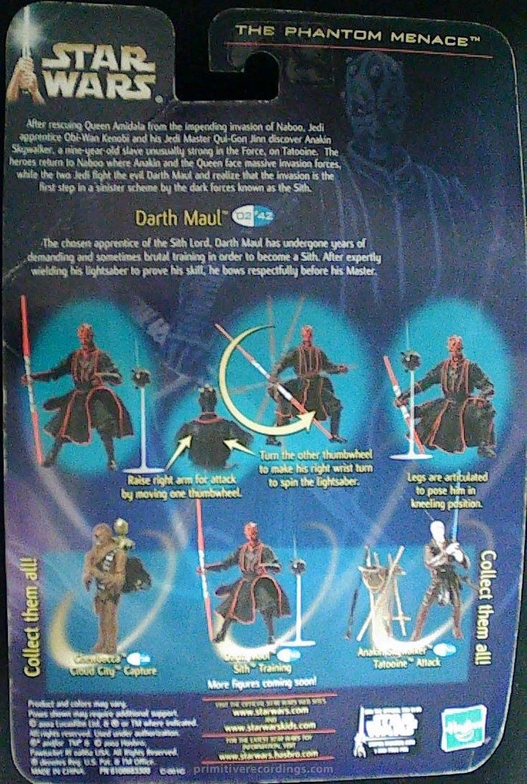 Experience the intensity of Sith training with this detailed Darth Maul action set from the Phantom Menace Collection 1. Featuring Darth Maul equipped with his iconic double-bladed red lightsaber, this figure captures the essence of his combat prowess. The set also includes a probe droid with a stand, adding depth to your display or play scenarios. Despite a bend in the card, the figure and accessories remain in good condition, making this a valuable piece for collectors and enthusiasts seeking an authentic representation of Sith training and battle action.