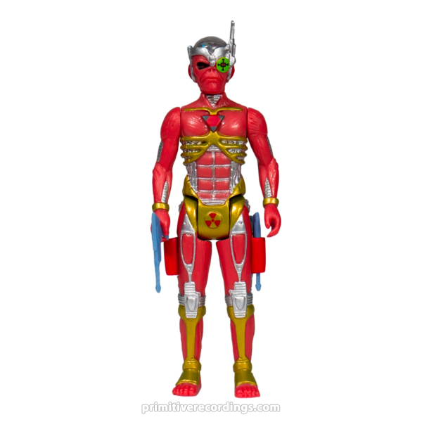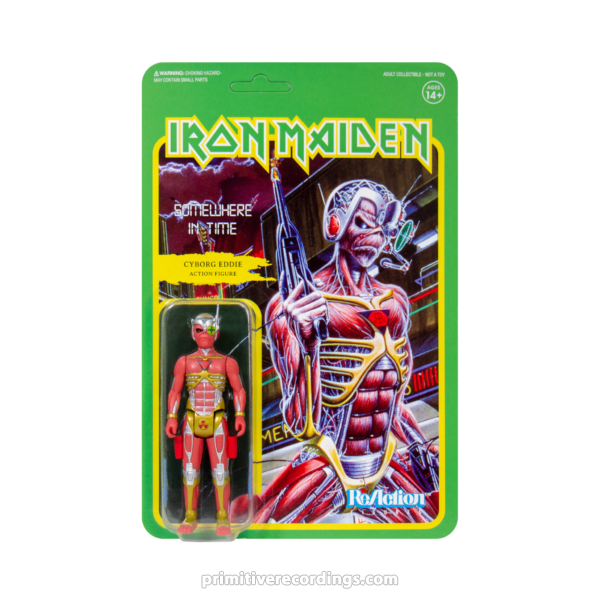 RARE. OUT OF PRINT. "Caught somewhere in time..." The official Super7 x Iron Maiden collaboration continues! Eddie from the 1986 Somewhere In Time album comes to life as a 3.75-inch ReAction figure! Cyborg Eddie features a clear skull that shows his cyborg brain and comes armed with 2 blaster pistols that he can held or put into holsters.