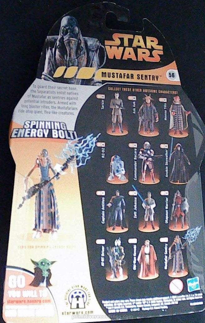 The Mustafar Sentry Revenge of Sith Spinning Energy Bolt #56 is a collectible item in good condition, capturing a dynamic moment from the Star Wars saga. This piece features the iconic Mustafar Sentry with a spinning energy bolt effect, showcasing detailed craftsmanship that appeals to dedicated fans and collectors alike. Its authentic design and quality make it a valuable addition to any Star Wars memorabilia collection, reflecting the intense atmosphere of the Revenge of the Sith era. Ideal for display, this item combines visual impact with expert-level attention to detail.