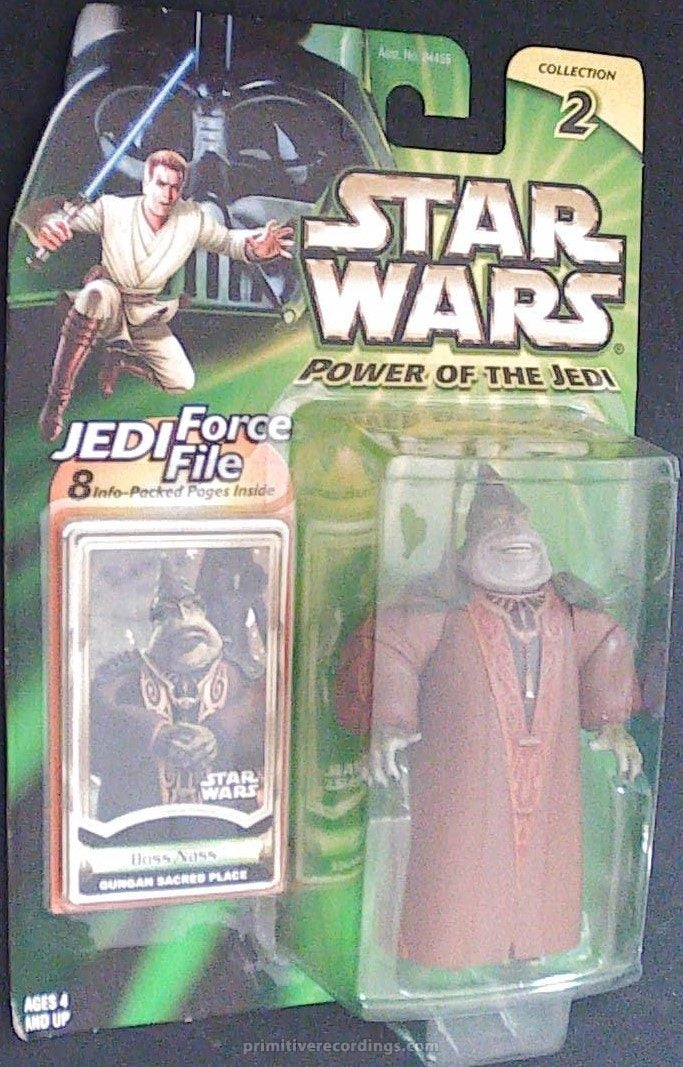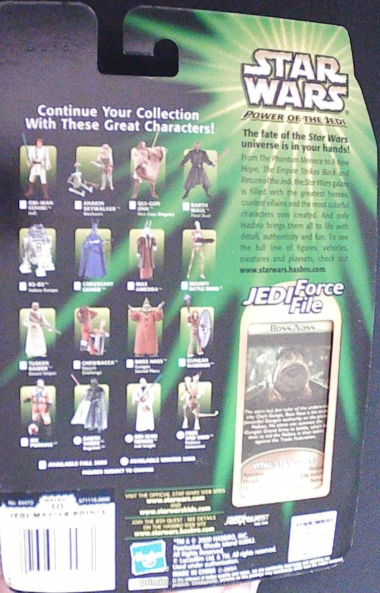 The POTJ Series 2 Boss Nass Gungan Sacred Place NOC is a collectible Star Wars card featuring the iconic Gungan leader from the Phantom Menace series. This card is in good condition, with only a minor bend in the card that does not detract from its overall quality or display value. A valuable addition for serious collectors, it captures the essence of Boss Nass and his sacred place, making it a sought-after piece for fans of the Star Wars saga and vintage trading cards alike.