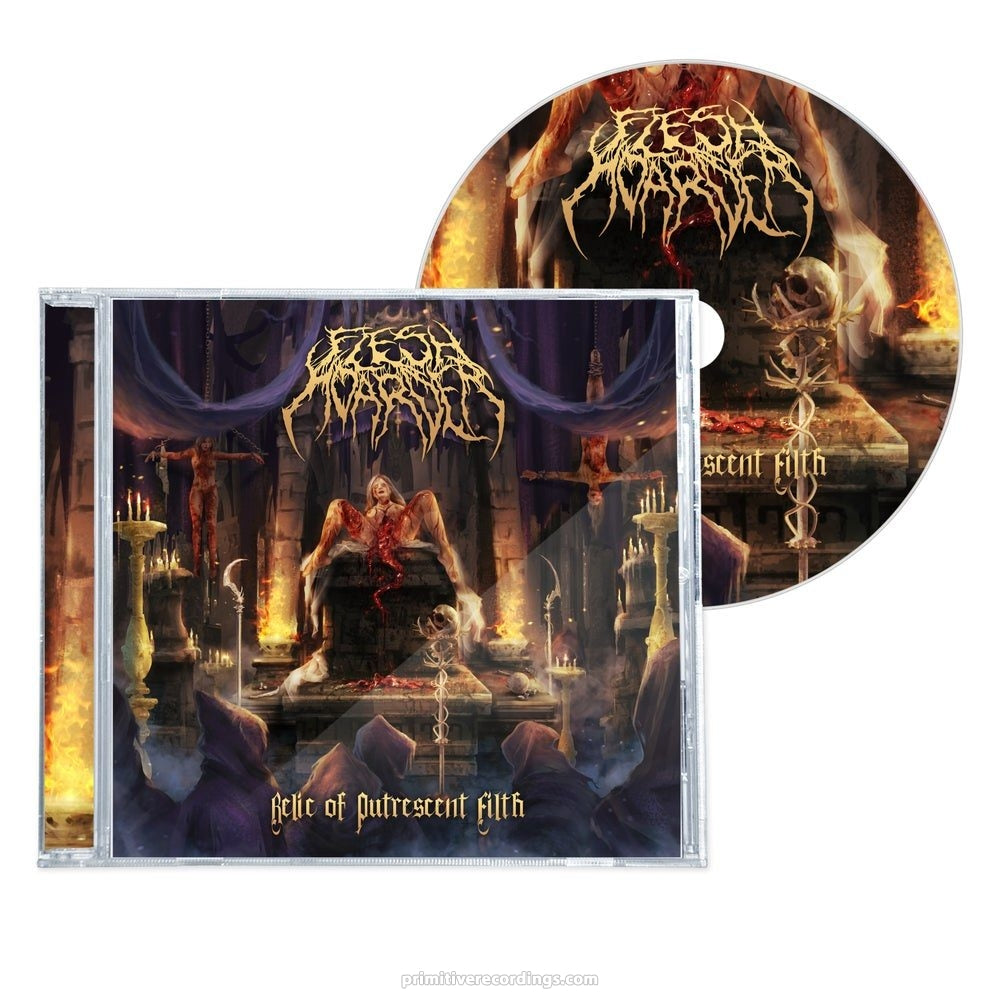 Flesh Hoarder's "Relic of Putrescent Filth" CD delivers a masterful blend of brutal death metal intensity and intricate musicianship. This release showcases the band's relentless aggression paired with complex riffs and guttural vocals, creating an immersive experience for fans of extreme metal. The production balances raw power with clarity, highlighting each instrument's contribution to the dense, putrescent atmosphere. Ideal for listeners seeking a sophisticated yet uncompromising sound, this album stands as a significant entry in the death metal genre.