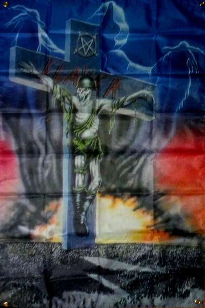 This large "Slayer Wehrmacht On The Cross" tapestry measures 3'x5' and features four grommets for simple and secure hanging. Perfect for fans looking to display this iconic design with ease.