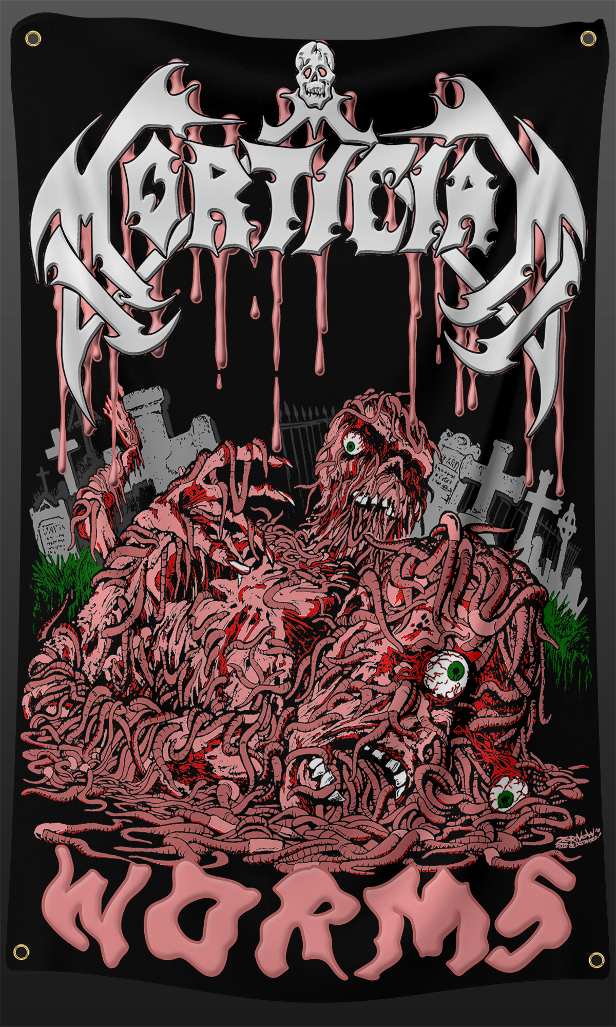 Display your appreciation for Mortician’s “Worms” with this striking 3 by 5-foot flag by Zornow. Featuring a high-resolution print and reinforced grommets in each corner, it’s designed for durability and vivid presentation. Limited quantities available, making it a distinctive addition to any collection or space.